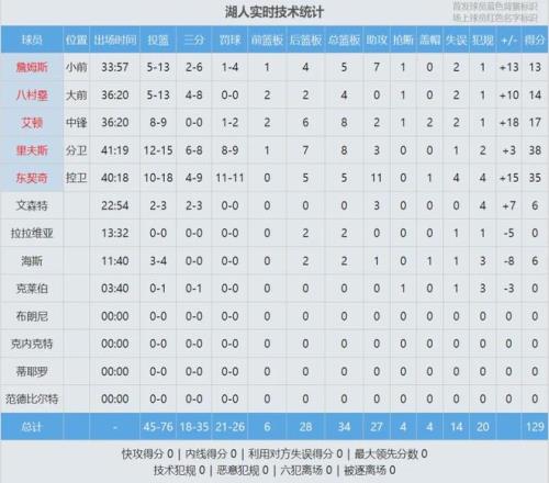 比赛还没结束,东契奇跟里夫斯已经联手砍下70+,独行侠匹配不上这种进攻强度。最后4分钟,湖人拉开到两位数。独行侠全队8人得分上双,已经尽力了,可惜缺少一个进攻大杀器。全场结束,湖人129-119战胜独行侠。