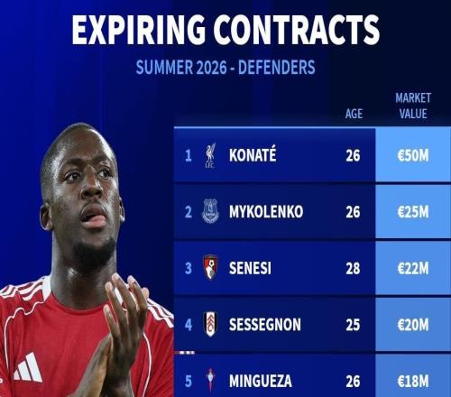 德国转会市场统计了今夏合同到期的十大后卫,其中球员按照身价从高到低排序。德转列今夏合同到期的十大后卫科纳特(利物浦) 身价5000万欧元米科连科(埃弗顿) 身价2500万欧元塞内西
